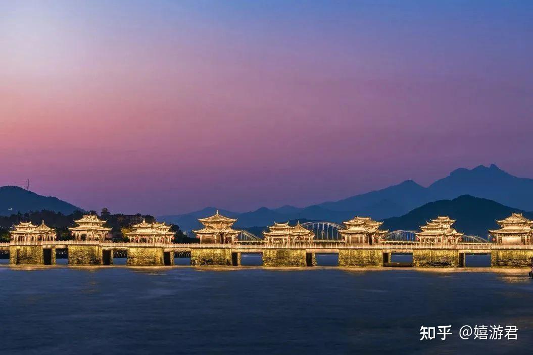 从大门(封神演义石雕)、前厅(知足常乐石雕)到拜亭(全祠最精彩的木雕),一路逛进去,到处都是值得细细品味的作品。广济桥?开放时间:10:00-17:00;灯光秀:8:00和21:30各一场,每场16min;10:00会拼船搭桥供游客同行,17:30会过河拆桥供游船通行门票:过桥20元/人